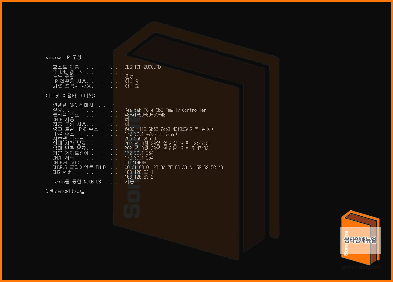 DHCP는 거의 대부분의 가정집에서 사용되고 있으며 공유기를 통해 ip를 분배받고 있다면 동적구성의 IP 환경 이다, 이때 서버는 공유기가 되는것이고, 이를 사용하는 클라이언트는 각각의 데스크톱이 되는것이다.