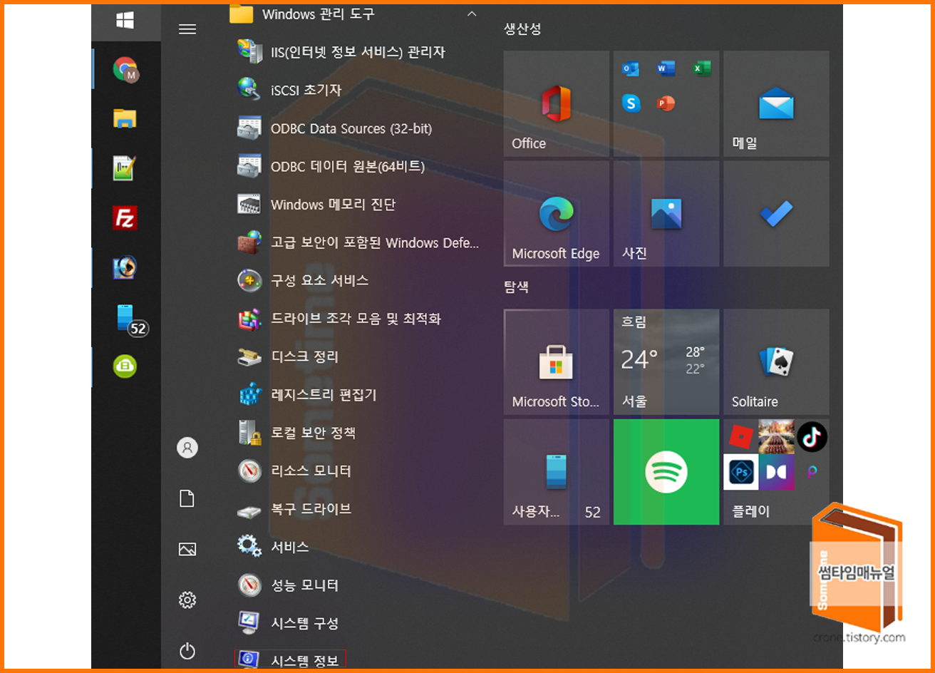 시작 버튼 -> Windows 관리 도구 -> 시스템 정보 선택