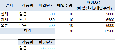 | 일자 | 상품명 | 매입단가 | 매입수량 | 매입자산 (매입단가x매입수량) |