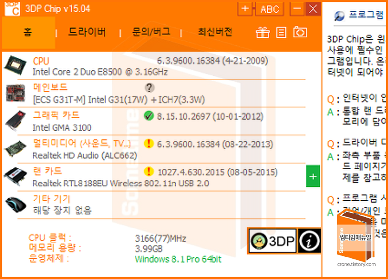 프로그램명 : 3DP Chip (3DP 칩) 설명 : 저용량 파일로서 윈도우 설치 후 드라이버 설치 혹은 드라이버 업데이트, 시스템 사양 확인시 쉽게 사용 가능합니다. 특징 : CPU, 메인보드, 그래픽, 사운드, 기
