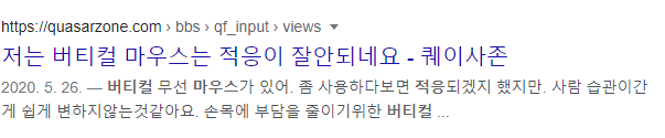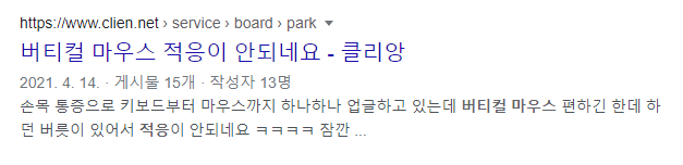손 바닥이 지면에 수평이 되는 자세를 하여 마우스를 이용하였던 습관이 하루아침에 적응하기란 생각보다 쉽지않은일 이다, 커서를 움직이는 정도는 바로 적응이 가능하지만, 스크롤 휠 버튼을 누르는 경우 비틀어진 마우스 각도에 맞춰 힘방향을 조절하는 것이 적응시 까지 시간이 꾀나 걸리는 편이다.