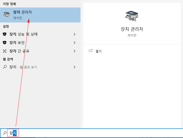 윈도우키를 눌러 "장치 관리자" 를 검색한 뒤, 장치관리자 창을 띄워주도록 한다.