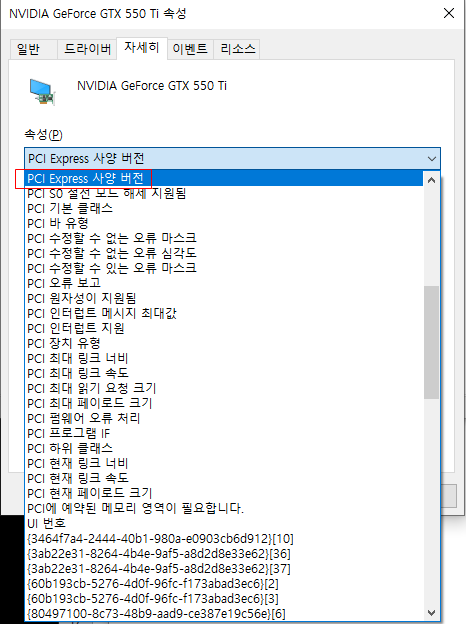 속성에서의 "자세히" 탭에 PCI Express 사양 버전 혹은 PCI 현재 링크 속도 를 선택하여 값을 확인해준다면 버전확인이 가능하다.
