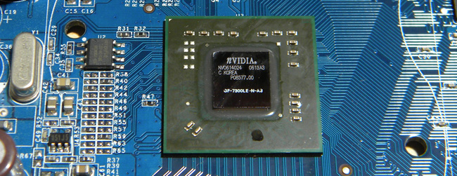 CPU에서의 처리된 연산 데이터들은 사용자의 눈으로 확인하기 위해서 연산데이터를 기반으로 영상신호로 변경하는 작업이 필요한데 해당작업은 GPU에서 이뤄지며 CPU와는 다르게 기판의 소켓이 구분되어 사용자가 장착과 해체를 임의로 진행할 수 없으며 위의 이미지와 같이 기판과 용접되어 맞닿아 있다.