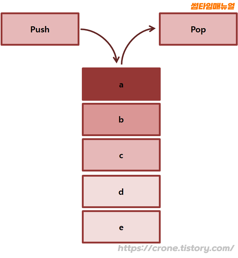스택은 자료를 입력하거나 도출되어 나오는 선현 구조의 형태로 구성되어 있으며 자료를 밀어 넣는다 하여 Push 라 칭하고 넣어둔 자료를 꺼낸다 하여 Pop이라 하는데 꺼내지는 자료는 가장 최근에 Push가 이뤄진 자료가 먼저 나오게 된다