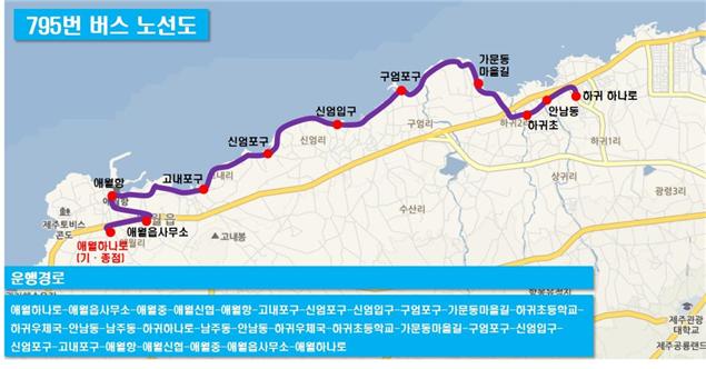 버스는 795번 버스로 도로의 폭이 좁고 렌터카의 통행량이 많은 점을 감안하여 소형버스가 70~80분 간격에 1대정도 투입되어 애월하나로마트를 기/종점으로 애월읍사무소를 경유하고 애월 해안도로를 통해 하귀하나로마트를 왕복 운행한다고 하여 렌터카의 계획이 없는 관광객도 버스를 이용하여 장관을 만끽할 수 있습니다