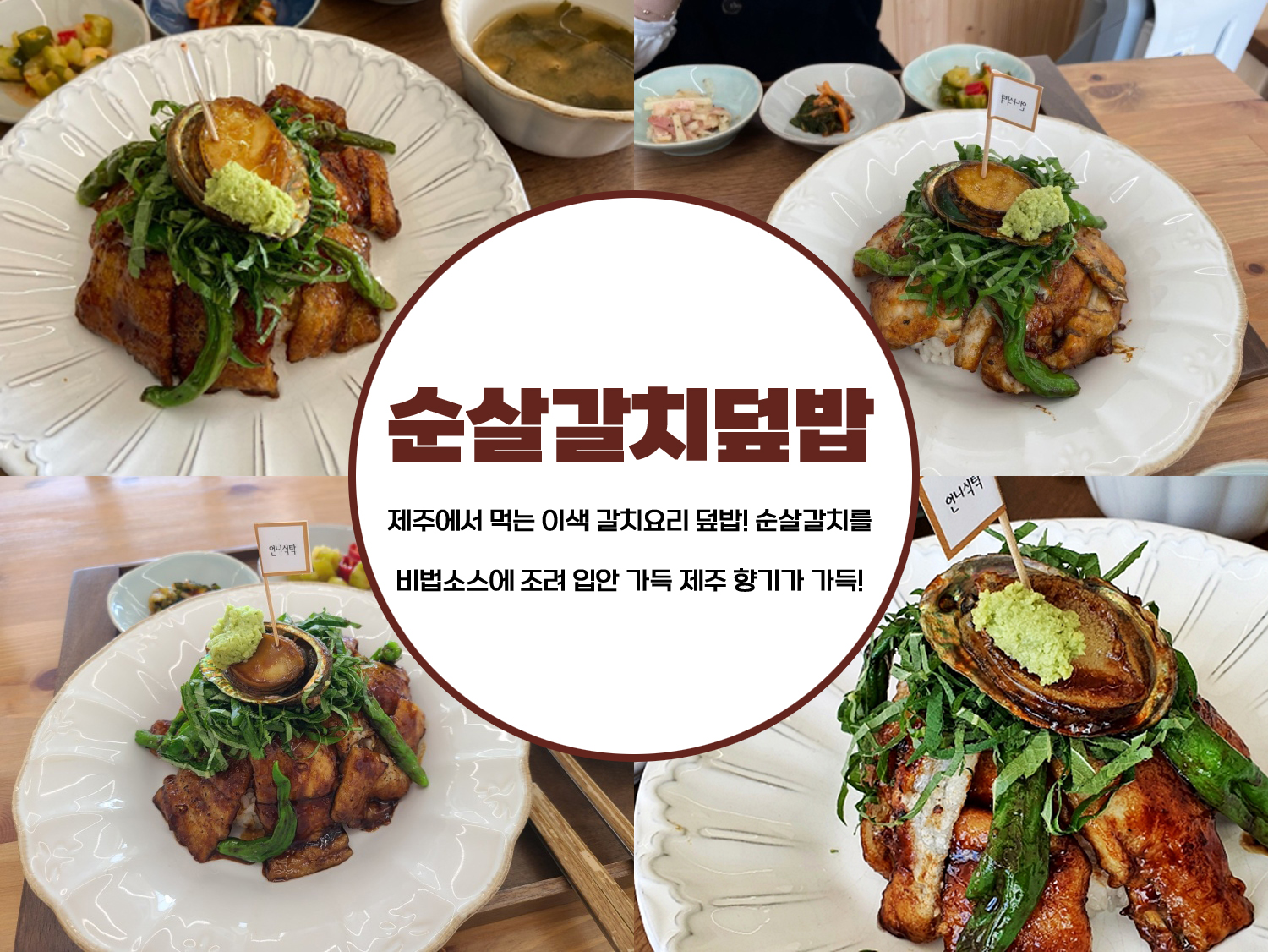 포슬포슬한 계란과 닭고기와 갈치가 언니 비법 소스 (6가지 특제 맛간장이 배합됨)에 살짝 조려 비린맛도 잡고 폭신한 식감에 마무리로 제주 전복을 올려 마무리, 소스에 꽈리고추도 함께 조려 고추향 머금은 덮밥, 고추냉이를 살짝 올린 갈치살에 채친 깻잎을 올리고 꽈리고추를 함께해 한숟갈 먹으면 새로운 조합의 맛
