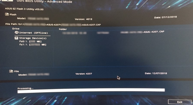 Processing 을 통해 현재 진행상황을 알 수 있으며 작업 진행중에는 전원공급이 끊기거나 도중 시스템이 다운되지않도록 주의하여야 하며 업데이트중 전원인가가 되지않아 중단되는경우 메인보드가 작동되지 않을 수 있는 문제가 발생할 수 있어 꼭 주의하도록 하며, Processing 이 완료되면 시스템은 자동으로 재부팅 된다.