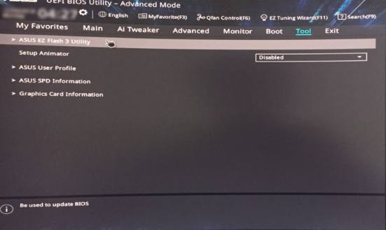 상단 항목중, Tool 항목으로 이동하여 ASUS EZ Flash 3 Utillity를 선택한다