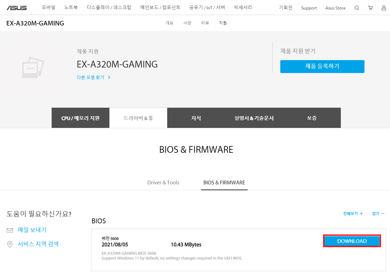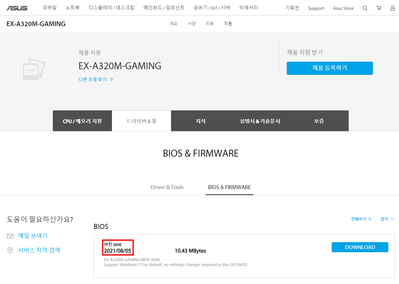 ASUS 브랜드를 예시로 바이오스를 다운받고자 한다면 위와 같은 화면이 확인되며 아래의 다운로드 버튼을 통해 최신 바이오스 버전을 다운받을 수 있다.