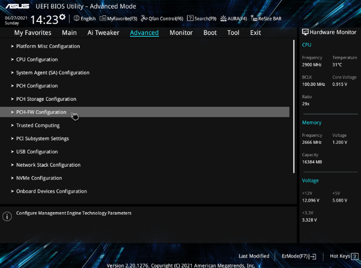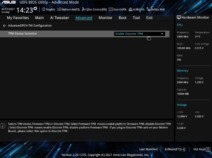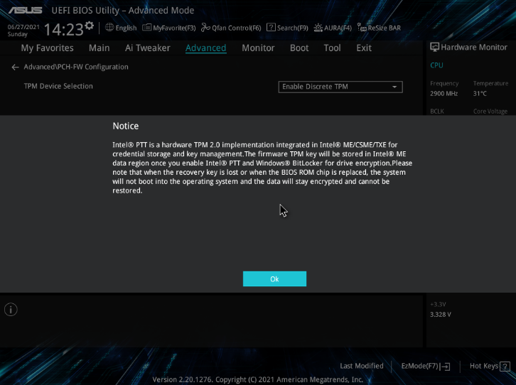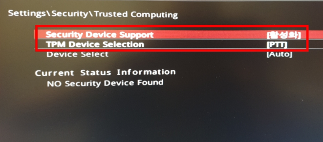 Settings -> Security -> Trusted compuing 항목의 TPM Device Selection 항목에 PTT 설정