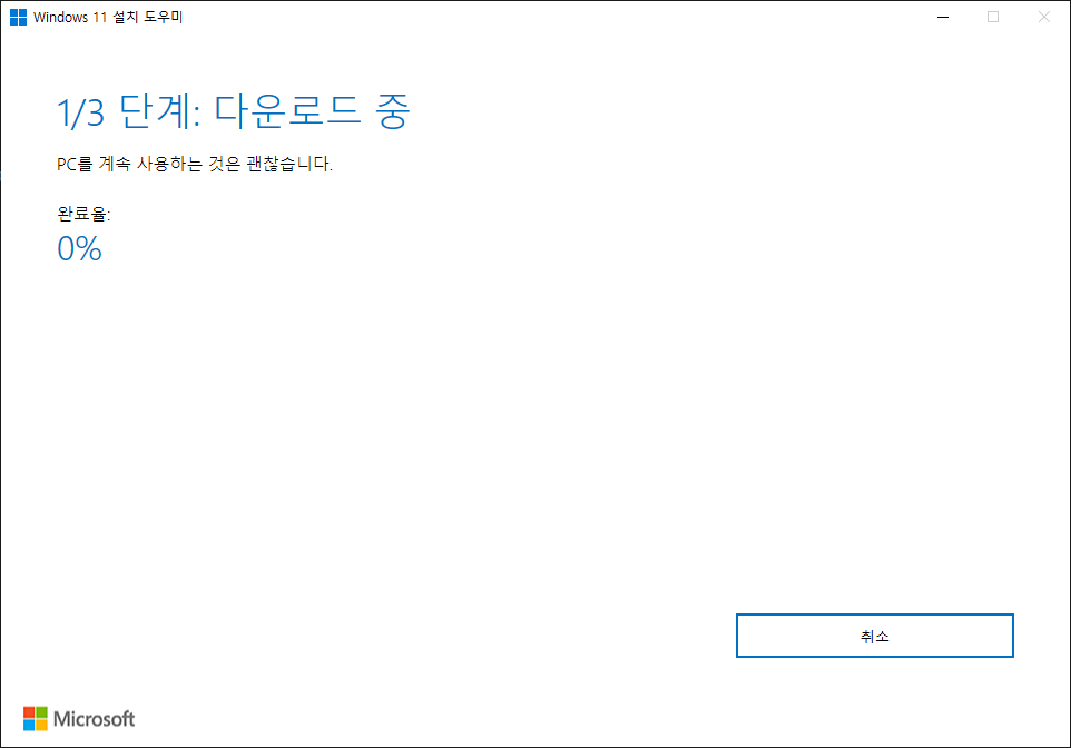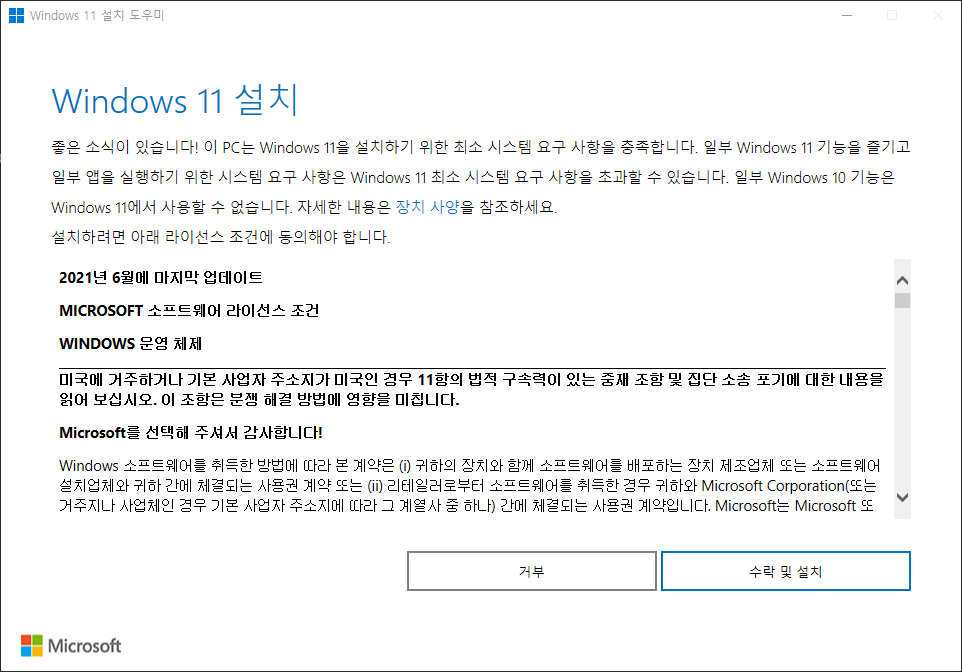 위의 아이콘은 마이크로소프트에서 제공하고 있는 Windows11 업그레이드 파일이며 실행 시 아래와 같은 화면이 확인된다