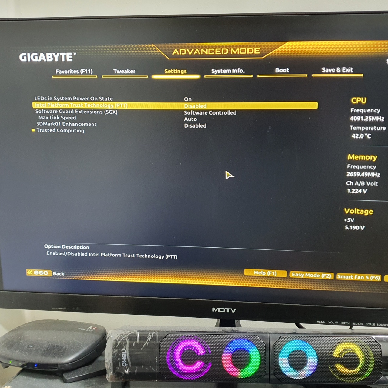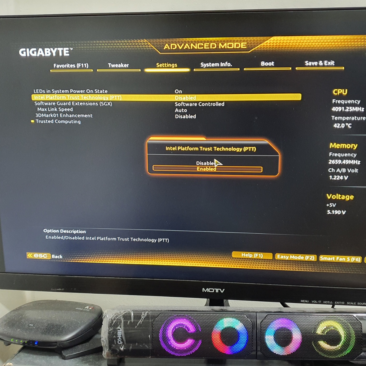 Intel Platform Trust Technology(PTT) 항목을 Enable 변경