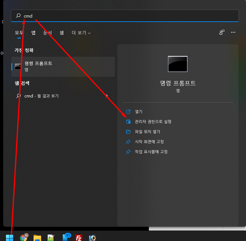 윈도우 키를 눌러 cmd (커맨드도스 명령어) 입력 후 "명령 프롬프트" 를 관리자 권한으로 실행 하며 아래의 값을 입력해 주도록 합니다