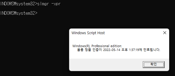 KMS 서버로 부터 인증을 받는 경우 6개월 마다 갱신되어야 하며 정품 인증 만료일이 되어 재 인증이 필요한 경우 위의 방법으로 인증받을 수 있습니다