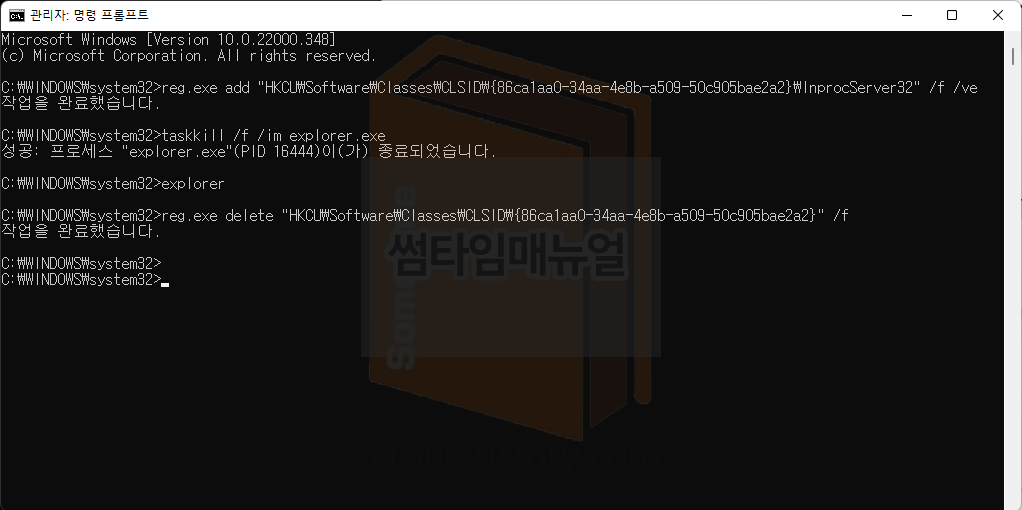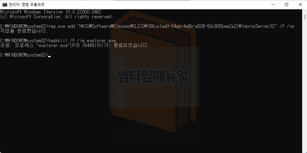 위의 명령어를 입력 후 explorer 프로세스를 재실행 합니다