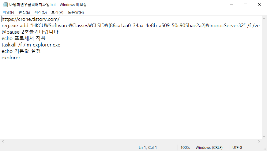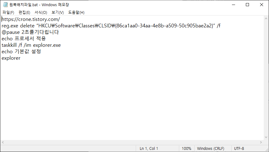위의 명령어들의 입력이 어려운경우라면 직접 만든 배치파일을 관리자권한으로 실행하여도 됩니다