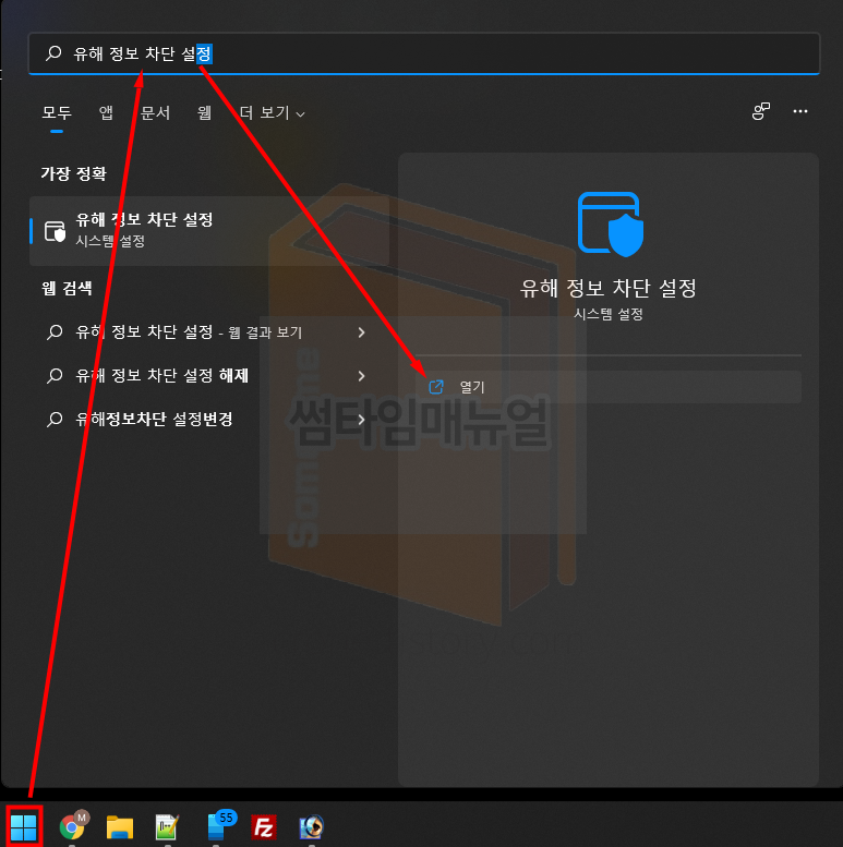 윈도우 버튼을 클릭하여 "유해 정보 차단 설정" 을 검색하여 설정 화면으로 이동합니다