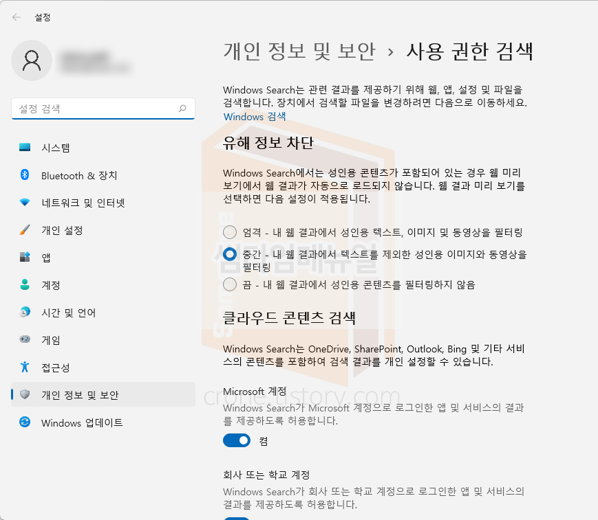 Windows 운영체제에서는 Windows Search 서비스에서 관련 결과를 제공하기 위해 웹, 앱, 설정 및 파일을 검색하며 컨텐츠 내에 내재된 유해한 컨텐츠로 판단되는 내용을 미리보기 또는 웹 결과에서 자동으로 로드되지 않도록 설정할 수 있습니다