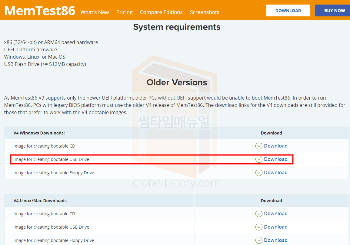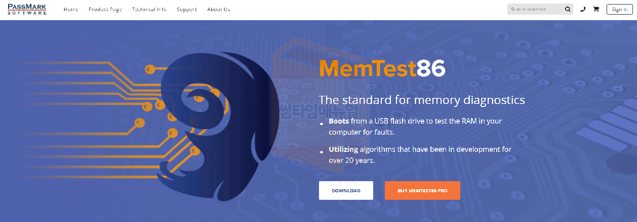 앞서 설명된바와 같이 메모리는 데이터를 사전에 미리 기억하고 있다가 필요시에 CPU에 전달하는 역할을 수행하고 있는데 정상적으로 데이터의 전달이 이뤄지지 않는 경우라면 이를 점검하기 위해 Windows내에서 제공하는 툴을 이용하여 점검할 수 있겠지만 일단 운영체제를 통해 부팅이 이뤄진 경우라면 이미 메모리를 어느정도 할당하여 사용하고 있기 때문에 메모리 총용량의 일정 부분은 이미 사용중이기 때문에 테스트가 불가능하여 memtest86 툴의 경우 Windows에서 실행되는 방법이 아닌 USB를 memtest86으로 부팅 디스크를 만들어낸 뒤 해당 툴로 부팅하여 점검하기 때문에 할당되는 메모리 자체가 작은편이라 거의 대부분의 메모리자원을 테스트해볼 수 있어 정확한 진단이 가능하며 해당 툴은 아래의 링크를 통해 다운로드 받을 수 있습니다.
