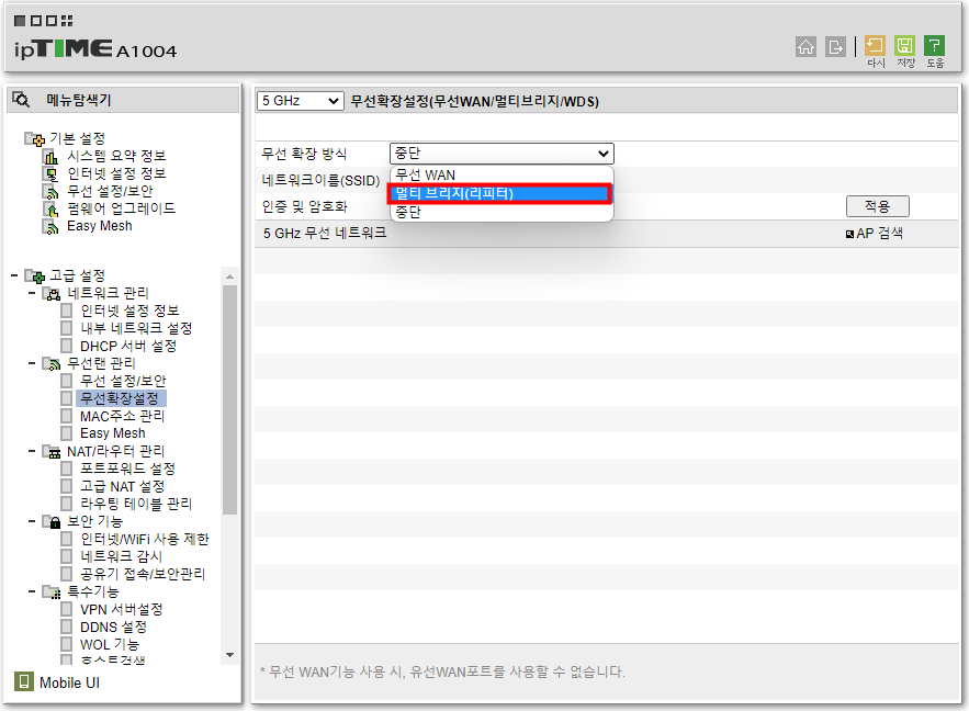 멀티 브릿지 기능은 무선 기능을 지원하는 공유기 모델에서만 사용이 가능하며 멀티 브릿지 기능을 활성화 함으로써 같은 대역의 네트워크를 늘려주는 역할을 하게 되며 해당 설정은 증폭할 서브 공유기에서 아래와같이 설정합니다.