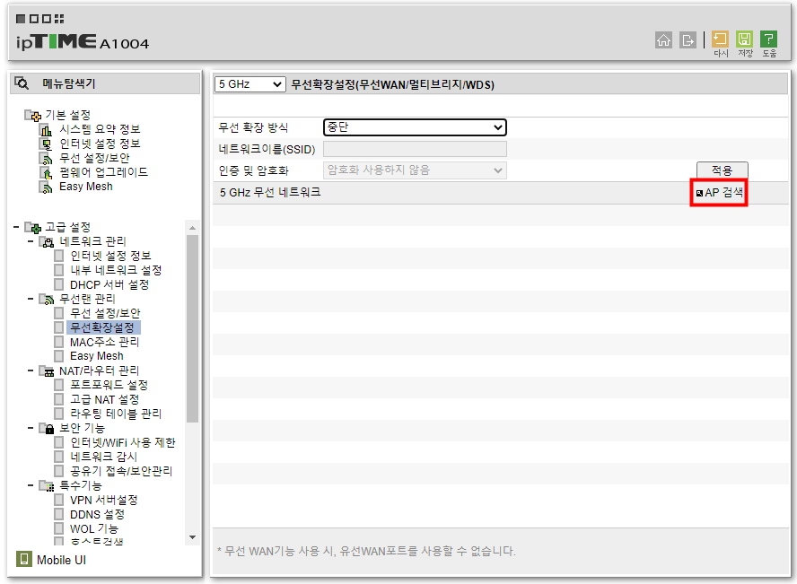 무선확장설정 항목에서 AP 검색 항목을 선택하여 네트워크를 설정해 준다면 무선을 통해 동일 네트워크에 연결됩니다