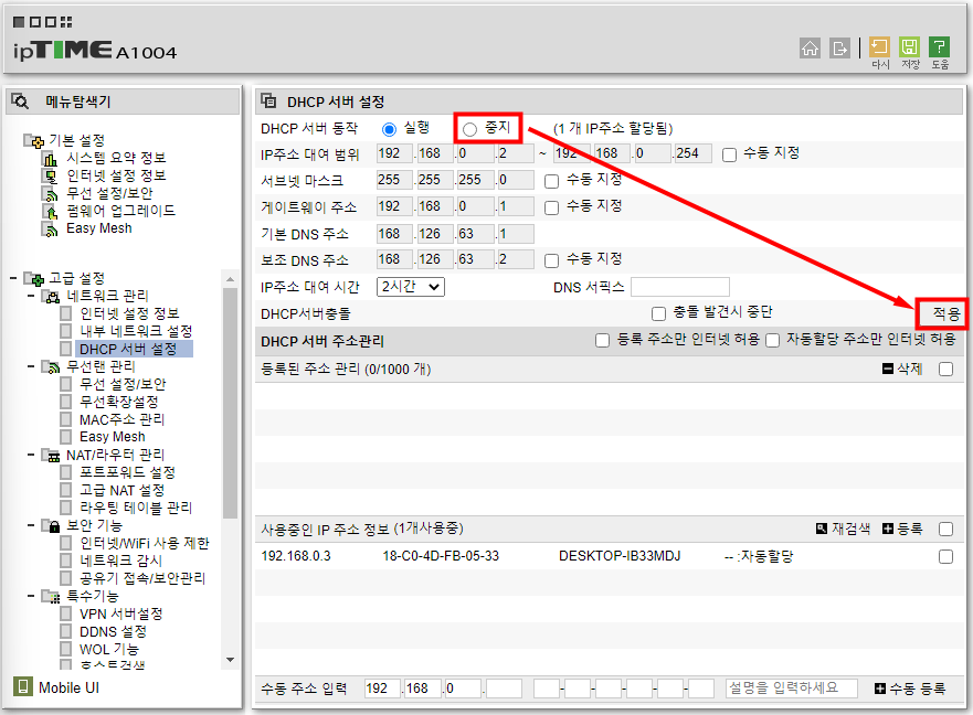 iptime 모델 기준으로 설명 되자면 DHCP라는기능은 외부네트워크 망에서 들어오는 ip를 내부 ip로 각각 할당 혹은 임대하여 관리하는 기능을 말하는데 해당기능을 중지시키면 공유기의 기능은 해제하고 단순하게 허브의 역할을 수행하게 됩니다