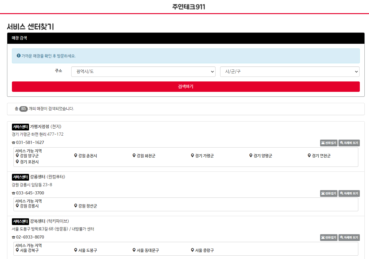 서비스 센터 찾기 - 주연테크911