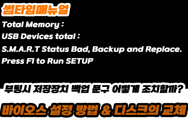 이전과는 다르게 부팅을 시도중 스마트 기능으로 상태가 좋지않다는 문구와 함께 백업을 해달라는 문구가 확인된다면 디스크의 손상을 의심해볼 수 있습니다 일반적인경우 하드디스크에서 문제가 발생된 경우 바이오스에서 부팅을 시도하면서 배드섹터의 발견이나 디스크에서 문제를 일으키는 경우 해당화면과 같이 확인되게 되는데 이때 조치해볼 수 있는 방법 두가지 알아보도록 하겠습니다