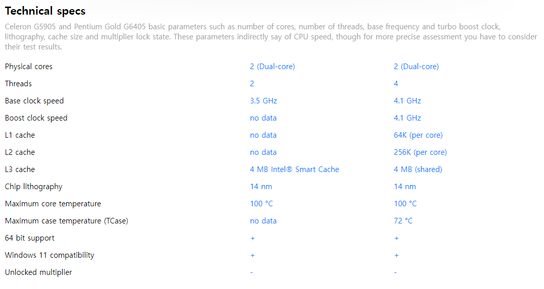 위의 비교 표는 인텔 셀러론 G5905 와 인텔 프리미엄 골드 G6405 모델간 각자의 클럭 그리고, 코어 등 여러가지의 구분을 비교해둔 성능 표 입니다 위와같이 클럭이 더 높아 분명 빠른 속도임은 맞지만 제한적인 코어 성능으로 차라리 펜티엄 등급보다는 i3 등급이 훨씬더 좋다 라는 평이 많습니다