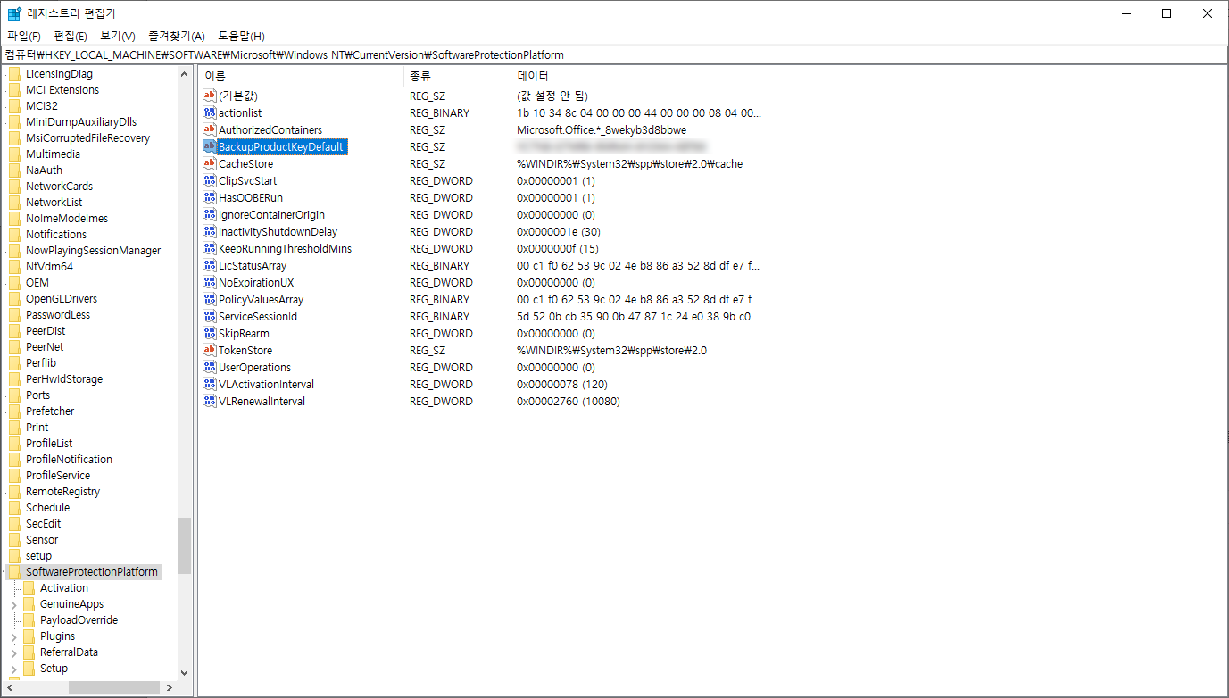 | 컴퓨터\HKEY_LOCAL_MACHINE\SOFTWARE\Microsoft\Windows NT\CurrentVersion\SoftwareProtectionPlatform |