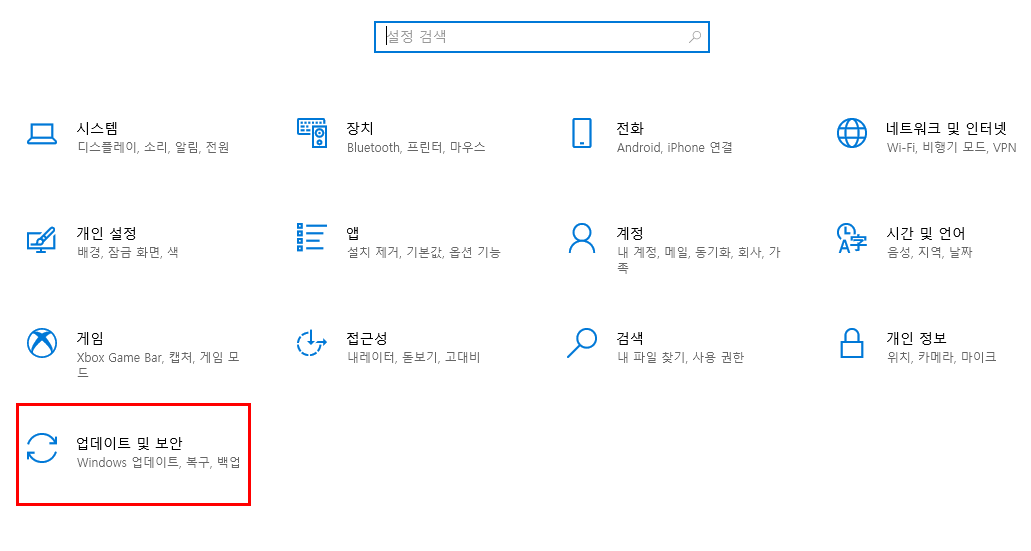 "업데이트 및 보안" 항목을 선택합니다