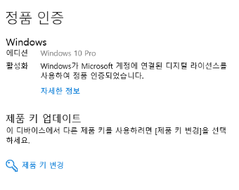 마이크로소프트 계정에 로그인이 된 상태로 정품인증이 되었다면 위와같이 디지털 라이센스를 통해 인증되었음을 확인할 수 있으며 가급적 정품을 이용한다면 마이크로소프트 계정도 같이 이용하여 계정에 라이센스키가 같이 물릴 수 있도록 사용하는것이 좋겠습니다
