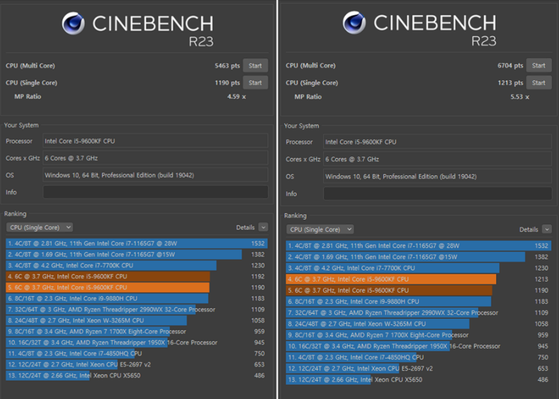벤치마크시 주로 사용되는 CINEBENCH 프로그램에서는 대략 1300점 정도의 멀티코어 점수가 차이나게되어 단일코어에서보다 멀티코어의 성능이 대폭 늘어났음을 알 수 있습니다