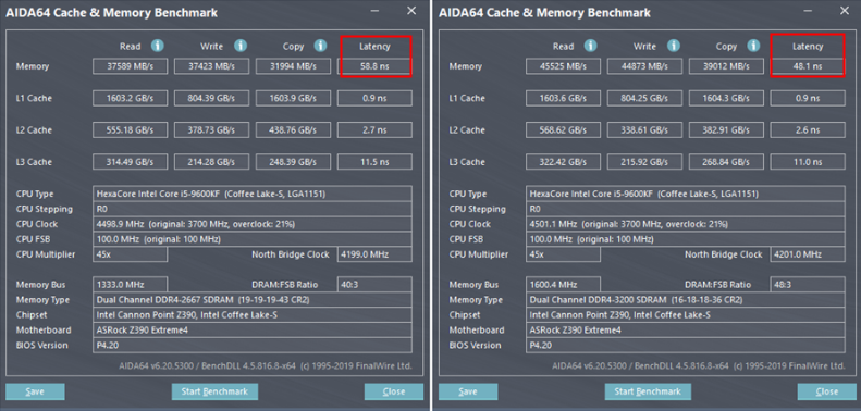 i5-9600KF 모델에서의 마이크론 메모리를 사용하여 XMP2.0 을 적용하였을 때 와 적용하지않았을 때의 비교한 내용입니다 적용전에서는 58.8ns 레이턴시(반응속도) 를, 적용 후 48.1ns 의 레이턴시 값이 변경되어 상당부분 반응속도가 빨라졌음을 알 수 있습니다