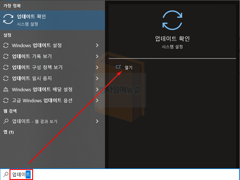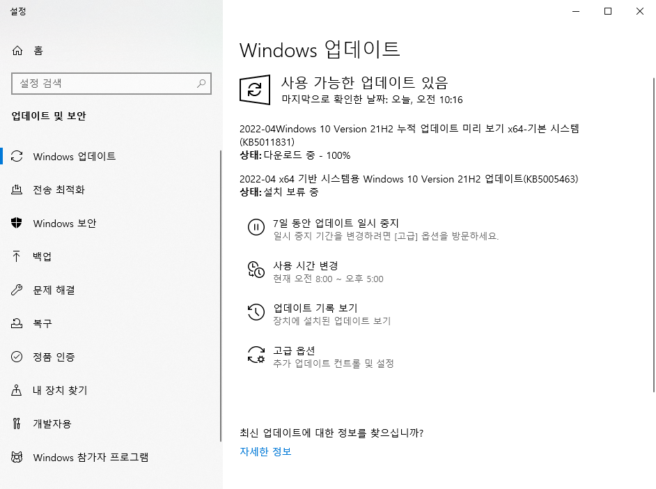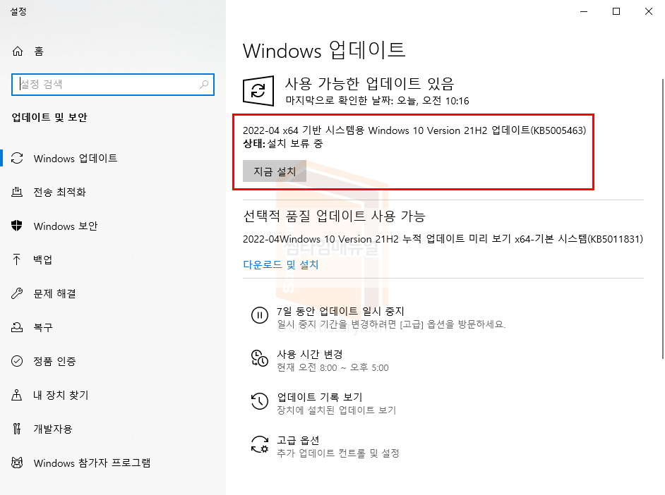 윈도우 버튼을 눌러 "update" 혹은 "업데이트 확인" 검색 시 위와같이 업데이트 확인 항목에 대해 확인할 수 있으며 "업데이트 확인" 버튼 또는 "지금 설치" 항목을 선택하여 업데이트를 받을 수 있습니다