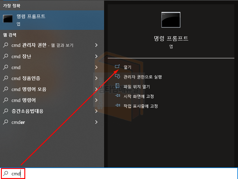 키보드의 윈도우 버튼을 눌러 "명령 프롬프트" 혹은 "cmd" 검색하여 명령 프롬프트 를 실행합니다