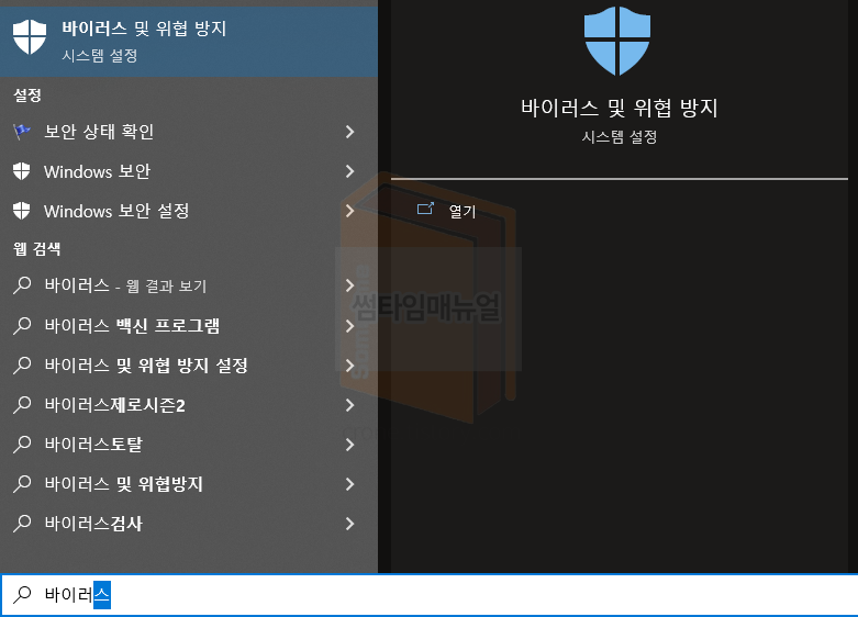 키보드의 윈도우키를 눌러 "바이러스 및 위협 방지" 또는 "virus" 검색 시 위와같이 바이러스 및 위협 방지 항목에 대해 찾을 수 있으며 해당 항목을 선택합니다