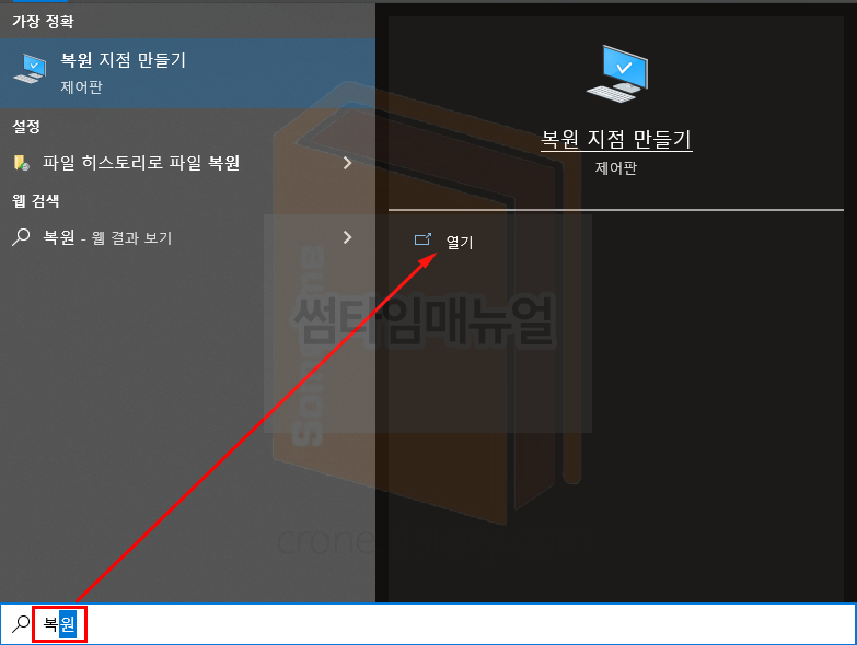 윈도우 버튼을 눌러 "복원 지점 만들기" 항목을 선택합니다