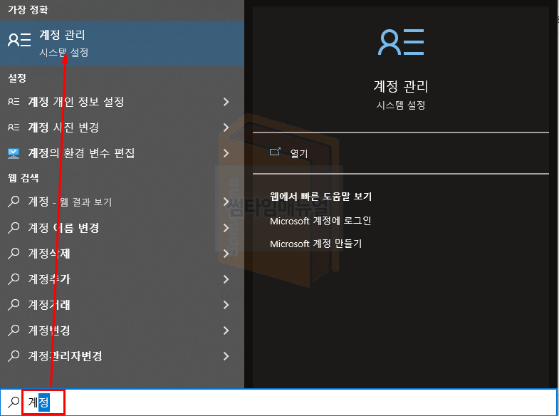 윈도우 버튼을 눌러 "계정 관리" 항목을 선택합니다