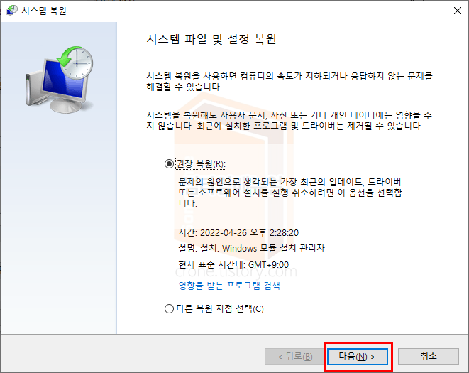 시스템 내에서 권장하는 복원 지점으로 복원을 희망한다면 진행하도록 하고 특정 복원지점이 있다면 "다른 복원 지점 선택" 항목을 선택하여 복원하도록 합니다