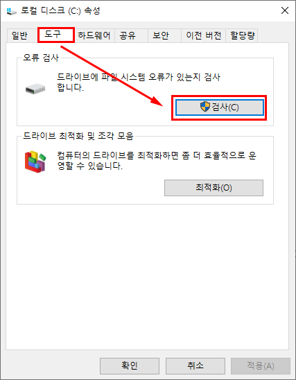 도구 탭으로 이동한 뒤 오류 검사 항목의 "검사" 버튼을 클릭하여 디스크를 점검합니다