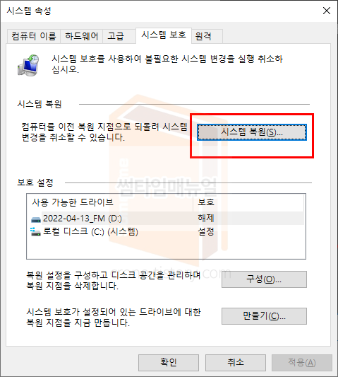 시스템 속성의 시스템 복원 항목을 선택하여 복원을 진행합니다