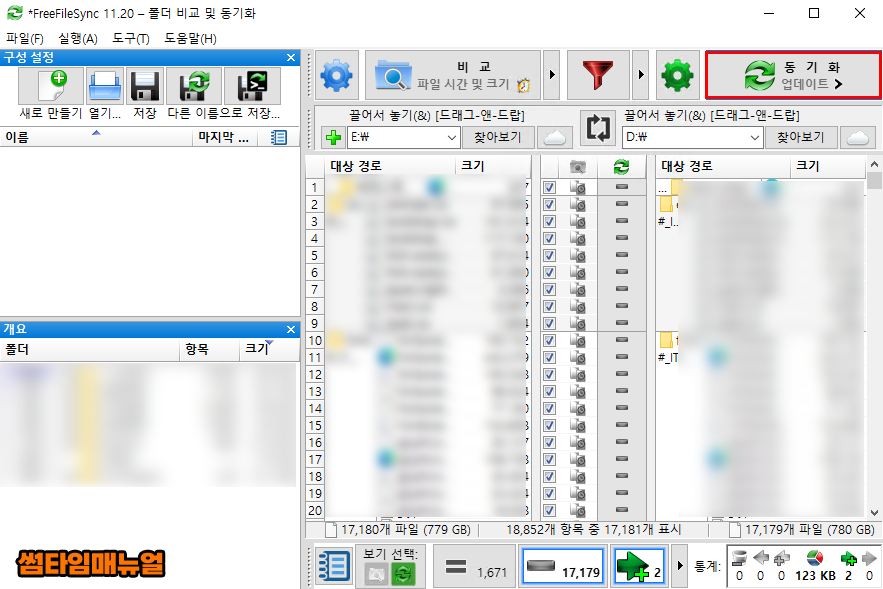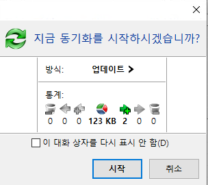 "시작" 버튼을 눌러 동기화를 실행합니다
