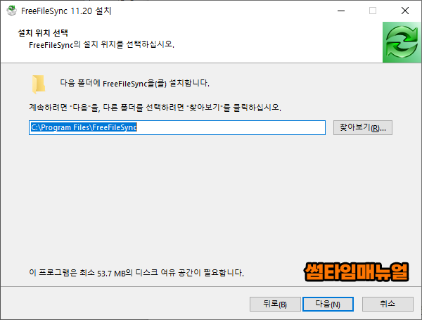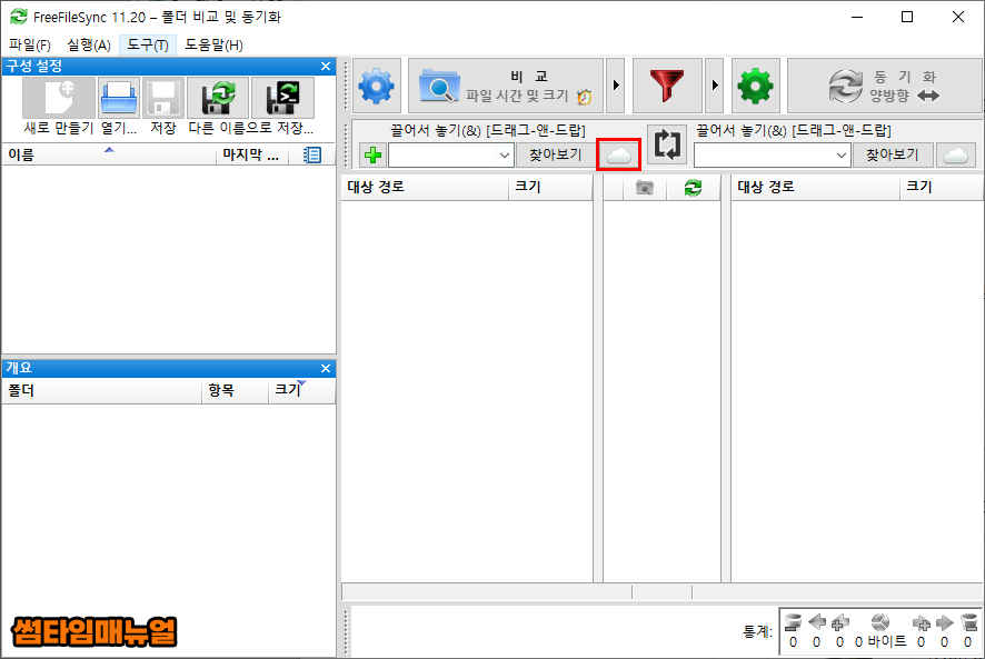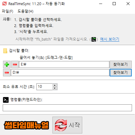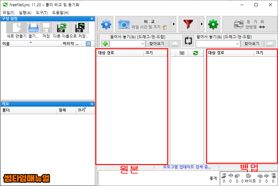 프로그램을 실행한다면 위와같은 화면이 확인되며 동기화할 원본과, 백업할 폴더를 선택할 수 있습니다
