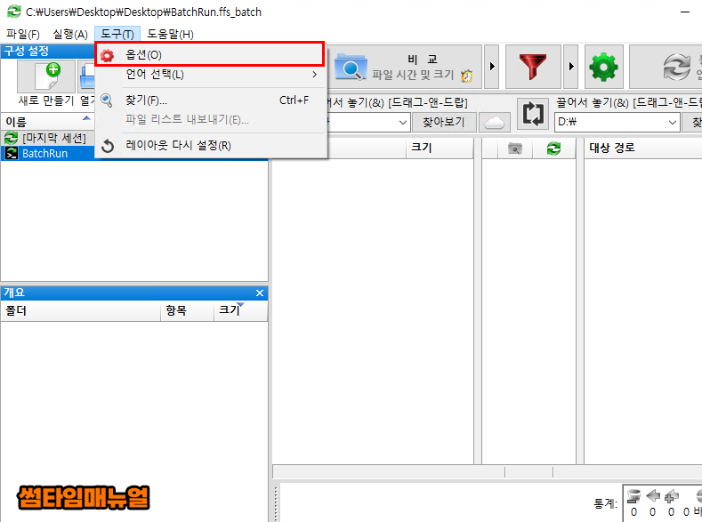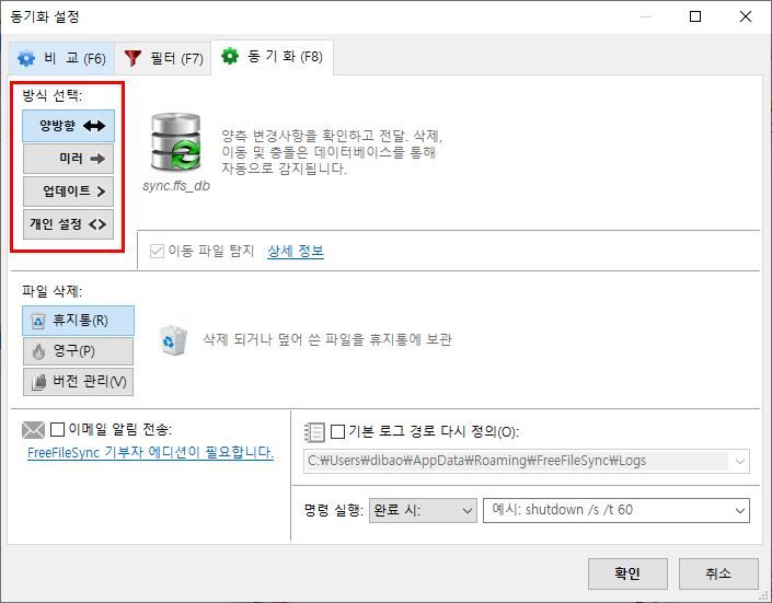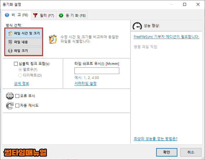 방식에는 파일 시간 및 크기, 파일 내용, 파일 크기 로 비교를 선택할 수 있으며 가장 일반적인 방법으로 "파일 시간 및 크기" 항목을 선택 합니다