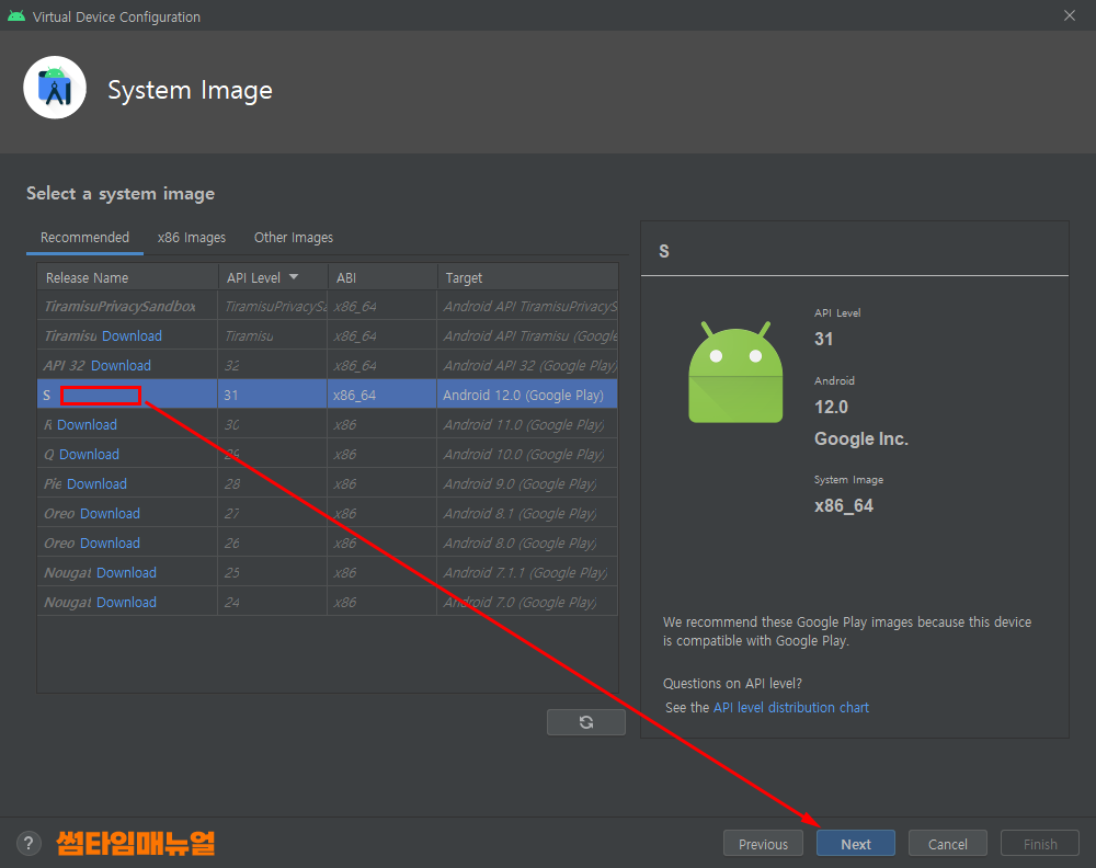 시스템 이미지는 선택한 가상장치에 단말기 실행시 필요한 안드로이드 버전을 선택하는 것입니다 가급적 안드로이드의 버전은 현재까지 출시되어있는 버전중에서 가장 상위 버전을 선택하는 편이 좋겠습니다 필자 기준으로 현재까지는 Android 12.0 버전이 최신버전이므로 해당버전을 선택합니다