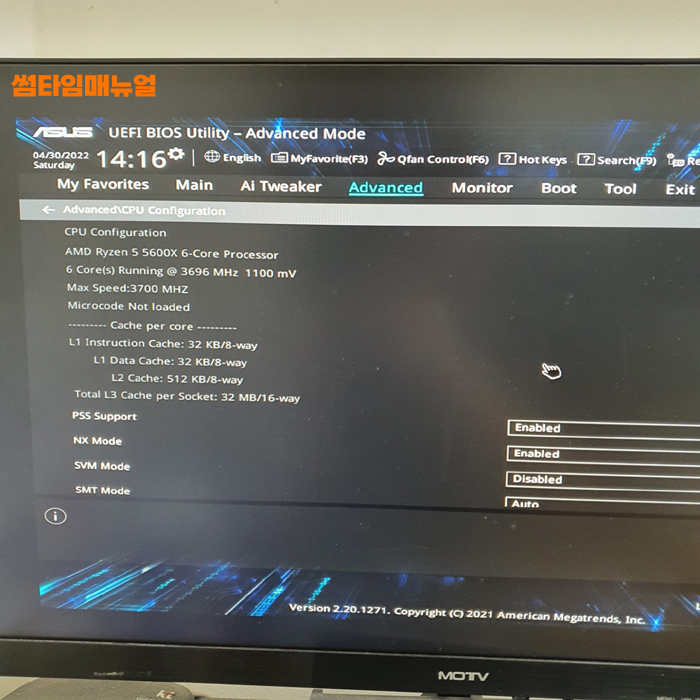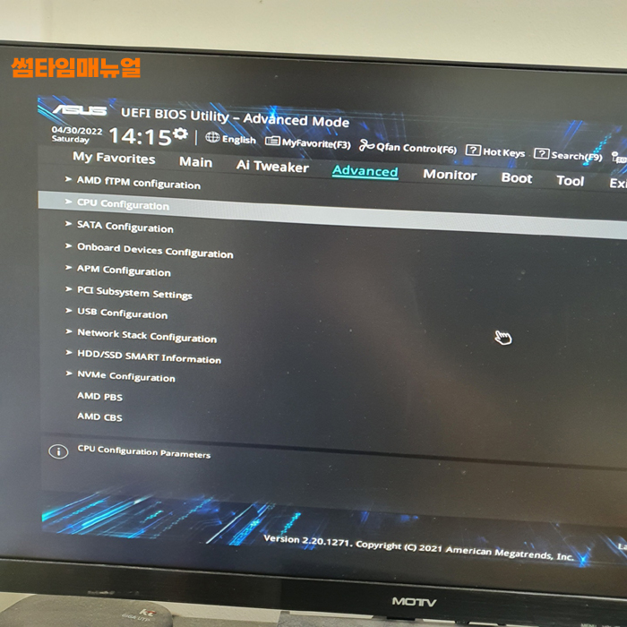 필자의 경우 5600X CPU 모델에 ASUS A520 메인보드를 사용하고 있으며 ASUS 메인보드 기준 바이오스의 진입은 부팅 후 Del 버튼을 눌러 진입할 수 있었으며 항목은 Advanced 항목으로 이동하여 CPU Configuration 항목으로 이동 합니다