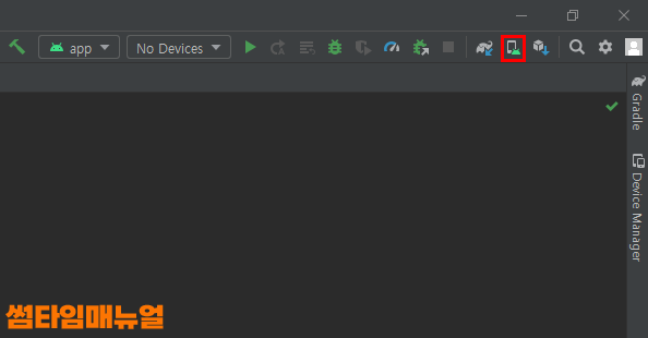 우측 상단에 보면 안드로이드 얼굴표시와 스마트폰이 나란히 포함되어있는 아이콘을 확인할 수 있으며 해당 아이콘이 Virtual Device Manager 실행 아이콘 입니다