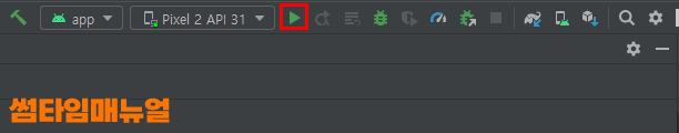 이제부터는 우측 상단의 플레이 아이콘을 선택하거나 Shift + F10 버튼을 눌러 현재 작성해둔 소스코드를 에뮬레이터로 전송하여 실행해볼 수 있겠습니다